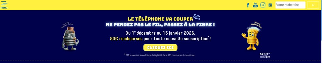 Afin d’encourager les usagers à franchir le pas, et ce dans un contexte ou l’extinction du réseau téléphonique cuivre est annoncée, ADTIM FTTH lance sur la commune une offre exceptionnelle de remboursement de 50 € pour toute première demande de raccordement à la fibre, effectuée entre le 1er décembre 2025 et le 15 janvier 2026.