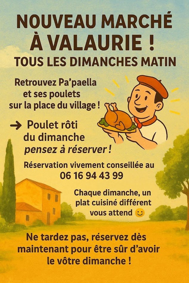 Le marché du dimanche matin reprend sur la place du Puits. Avec Gilles, marchand de fruits et légumes qui apporte également du pain (boulangerie artisanale) et à partir du dimanche 19/10, le Food Truck Pa'Paella sera présent. Chaque dimanche, il proposera du poulet rôti ou un plat cuisiné. Il dévoilera chaque jeudi le plat qui sera proposé le dimanche suivant. Merci de commander pour une meilleure organisation pour lui et un bon service pour vous.