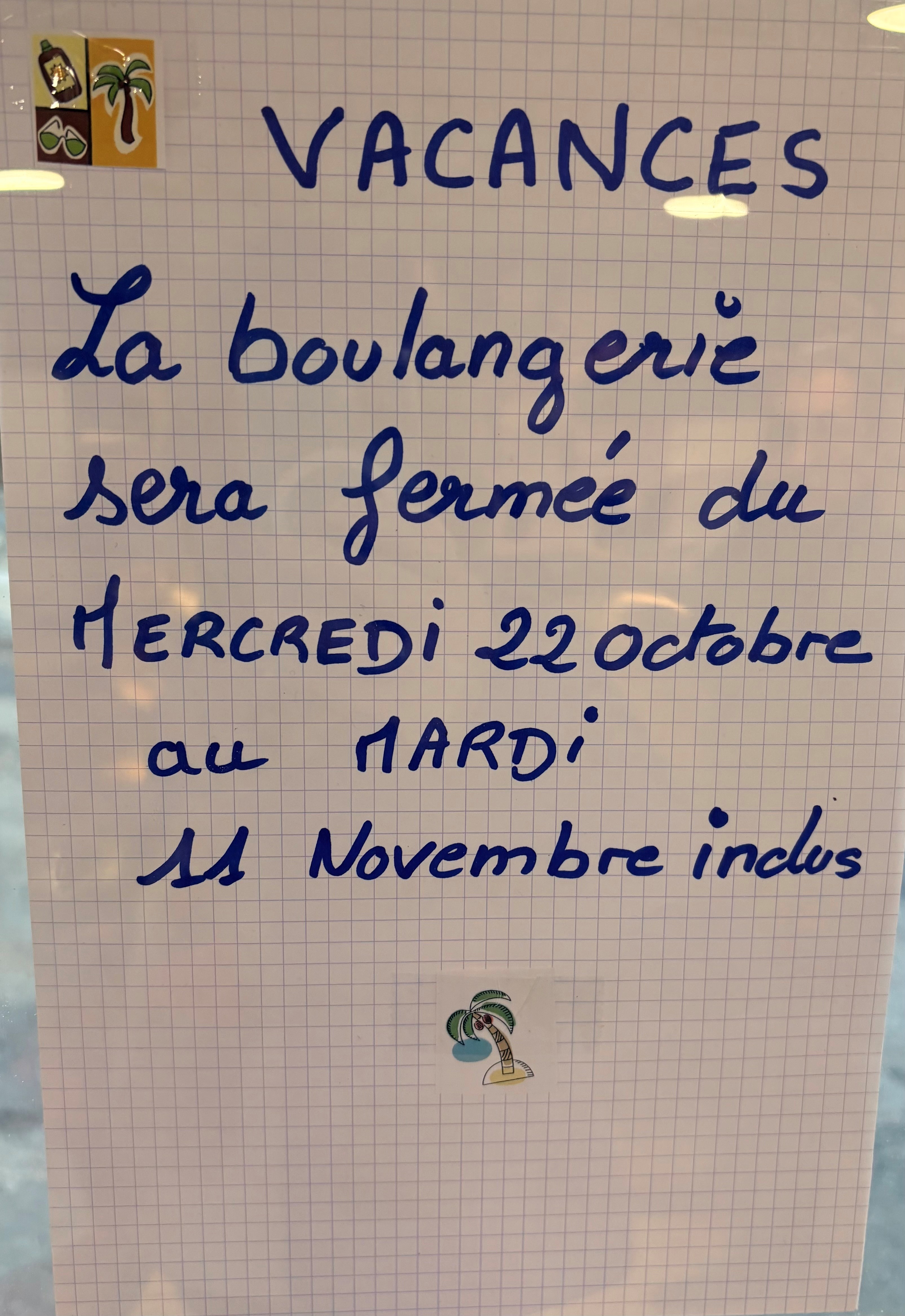 Fermeture de la boulangerie pour congés, du 22 octobre 2025 au 11 novembre 2025.