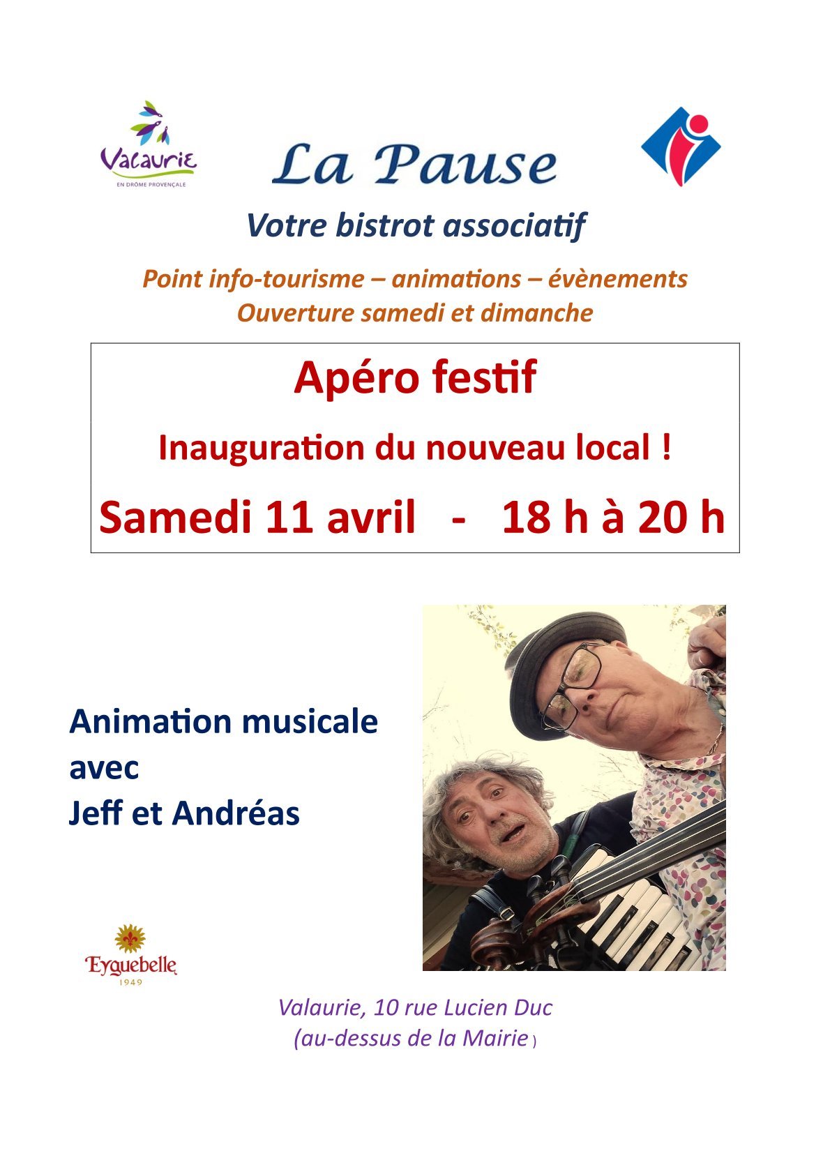 INAUGURATION de la nouvelle configuration "ambiance bistrot" le SAMEDI 11 AVRIL de 18 h à 20 h en musique avec JEFF & ANDREAS